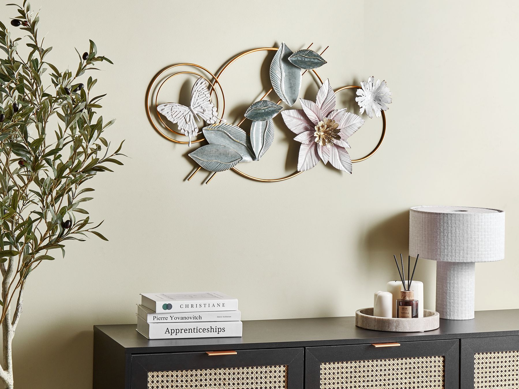 Add some shine and elegance to your interior with this beautiful wall decoration. Entirely made from iron ensuring durability and low maintenance, this piece presents the delicate composition of flowers, leaves, and a simple butterfly. The subtle colours complement the golden circles that will add glow to your wall. Thanks to the hooks at the back, you can hang this decor easily in your living room and enjoy the new sophisticated aesthetic.